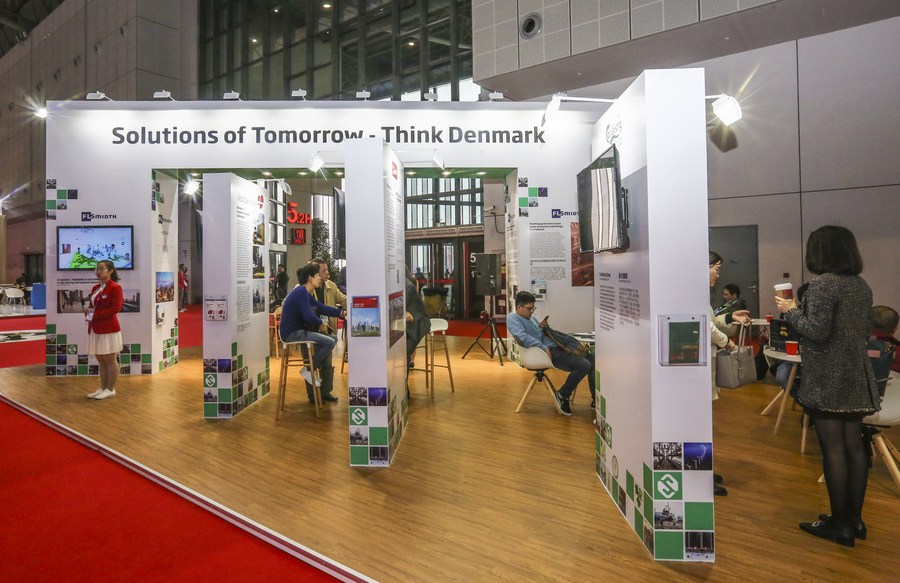 The booth of Denmark is seen at the first China International Import Expo (CIIE) in Shanghai, east China, Nov. 6, 2018. (Xinhua/Yin Gang)