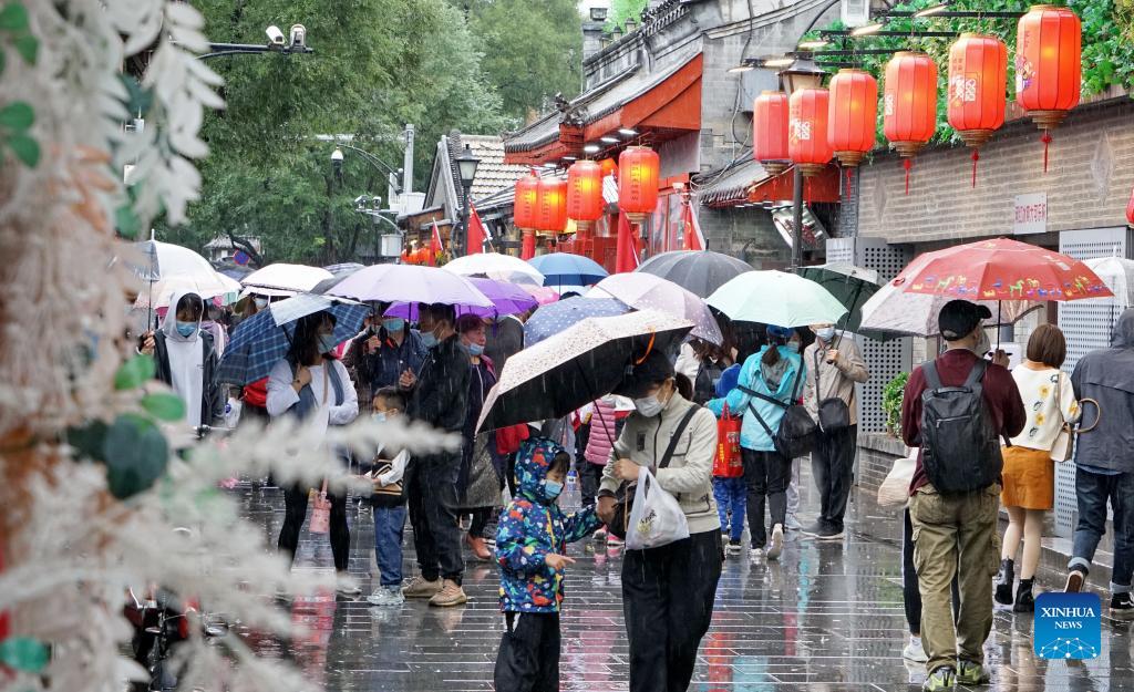 People visit the Nanluoguxiang Lane in rain during the week-long National Day holiday in Beijing, capital of China, Oct. 6, 2021. (Xinhua/Li Xin)