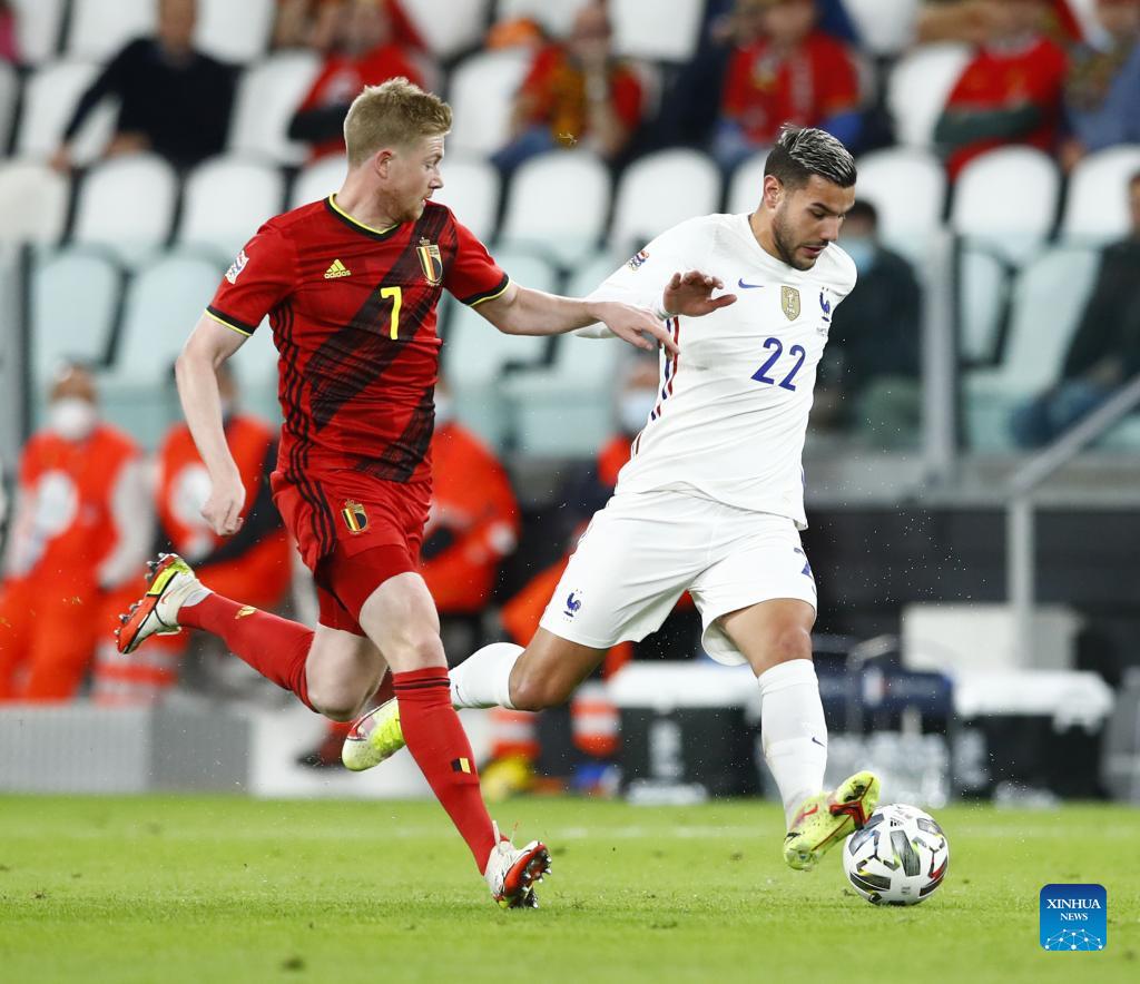 France's Theo Hernandez (R) vies with Belgium's Kevin De Bruyne during the UEFA Nations League semifinal between Belgium and France in Turin, Italy, Oct. 7, 2021. (Str/Xinhua)