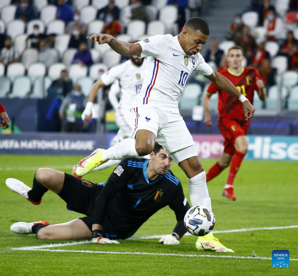 France's Kylian Mbappe (front, top) vies with Belgium's goalkeeper Thibaut Courtois during the UEFA Nations League semifinal between Belgium and France in Turin, Italy, Oct. 7, 2021. (Str/Xinhua)