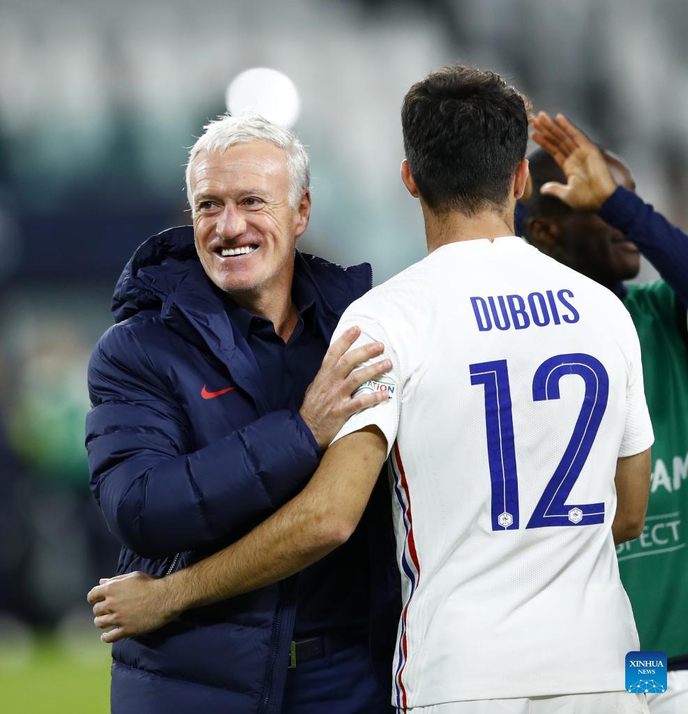 France's head coach Didier Deschamps (L) celebrates at the end of the UEFA Nations League semifinal between Belgium and France in Turin, Italy, Oct. 7, 2021. (Str/Xinhua)