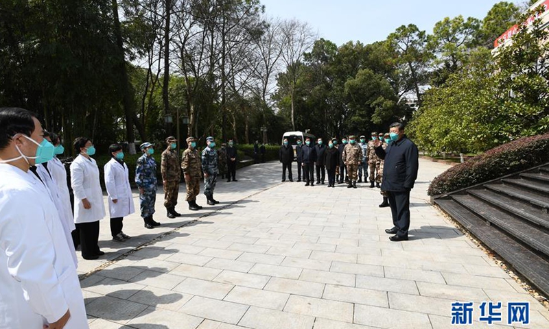 Xi Jinping visits representatives of health workers from Hubei Province and from the PLA and other provinces at Huoshenshan Hospital on March 10, 2020.
