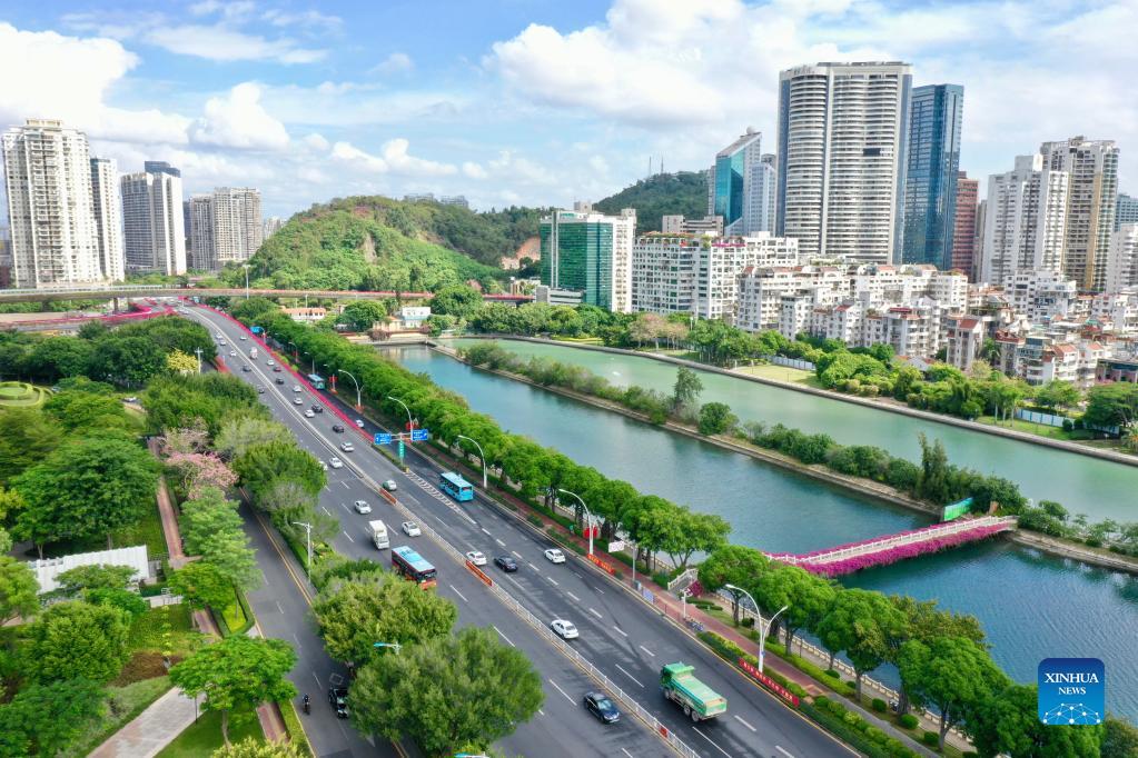 Aerial photo taken on Oct. 8, 2021 shows vehicles running on the road in Xiamen City, southeast China's Fujian Province. The city of Xiamen in southeast China's Fujian Province, which witnessed the country's latest resurgence of COVID-19 cluster infections, cleared all medium- and high-risk areas for COVID-19 on Thursday night. The city downgraded three medium-risk areas and one high-risk area for COVID-19 to low-risk areas starting 9 p.m. Thursday, according to the municipal epidemic prevention and control headquarters. (Xinhua/Jiang Kehong)