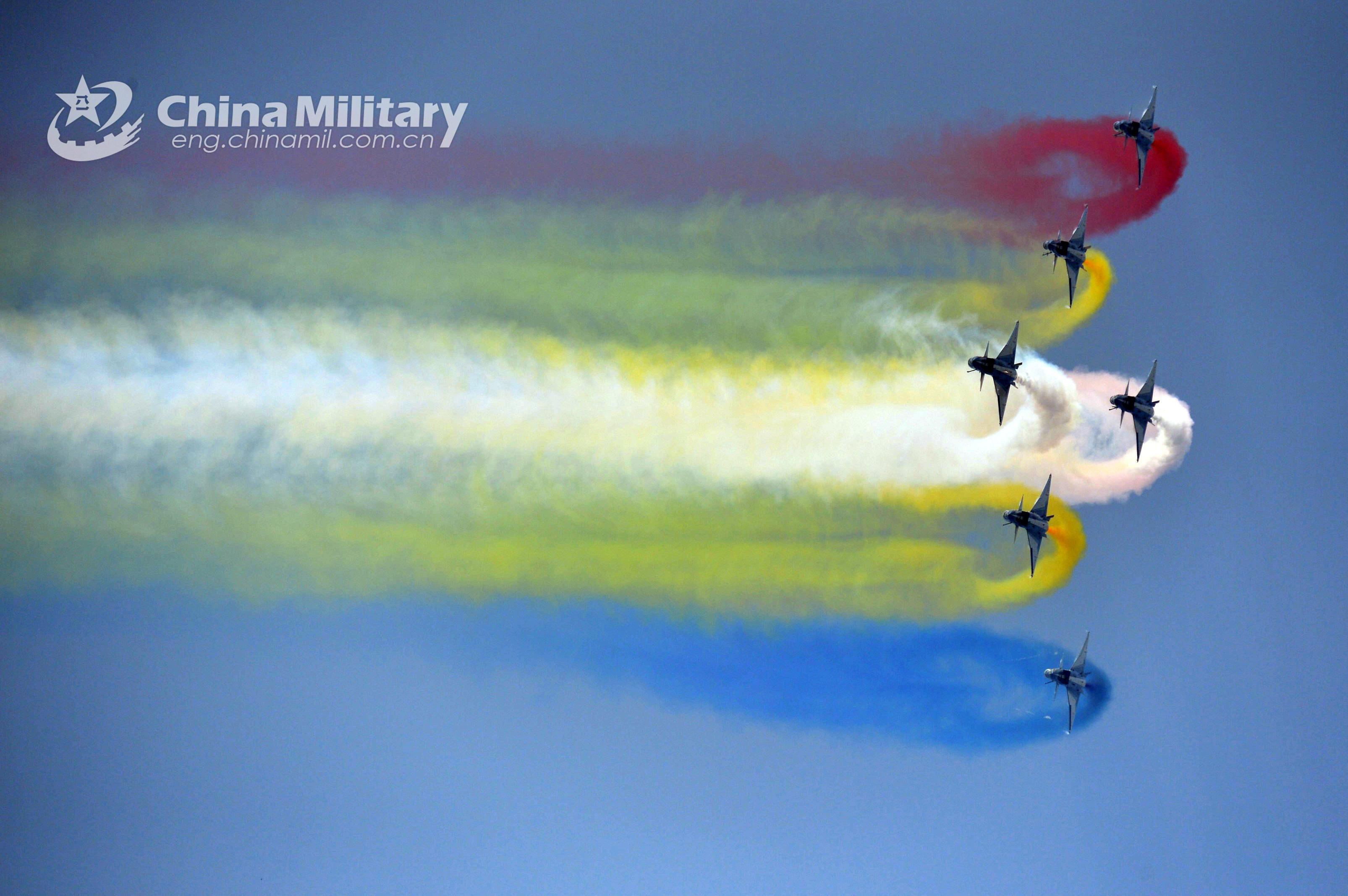 J-10 fighter jets attached to the PLA Air Force's Bayi Aerobatics Team perform aerobatic stunts during a six-day airshow in Zhuhai, South China's Guangdong Province, on Sept. 29, 2021. The 13th China International Aviation and Aerospace Exhibition, or Airshow China 2021, was held from September 28 to October 3, 2021. (eng.chinamil.com.cn/Photo by Yu Hongchun)