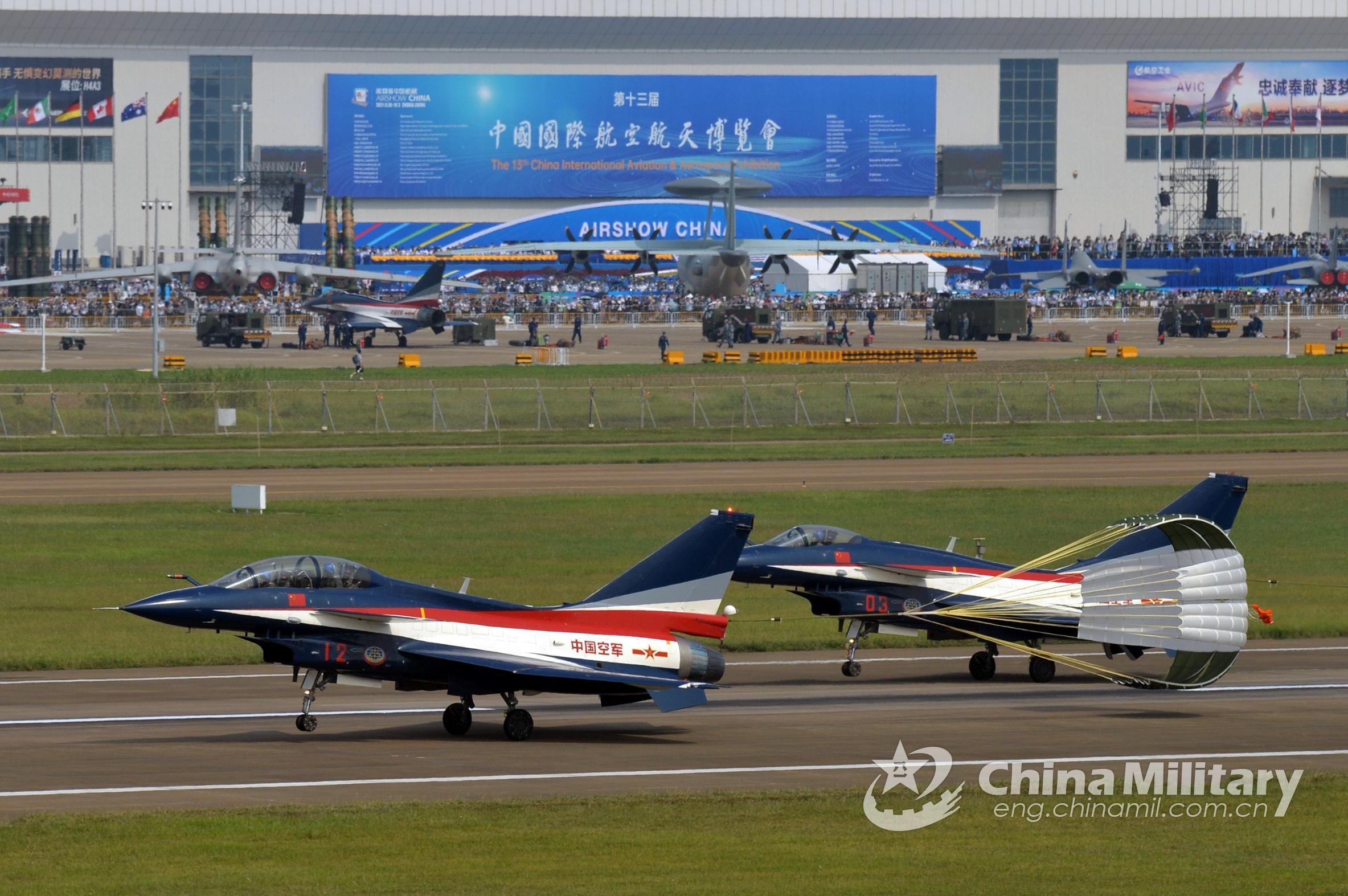 Two J-10 fighter jets attached to the PLA Air Force's Bayi Aerobatics Team taxi down the runway with drogue parachutes during a six-day airshow in Zhuhai, South China's Guangdong Province, on Sept. 29, 2021. The 13th China International Aviation and Aerospace Exhibition, or Airshow China 2021, was held from September 28 to October 3, 2021. (eng.chinamil.com.cn/Photo by Yu Hongchun)