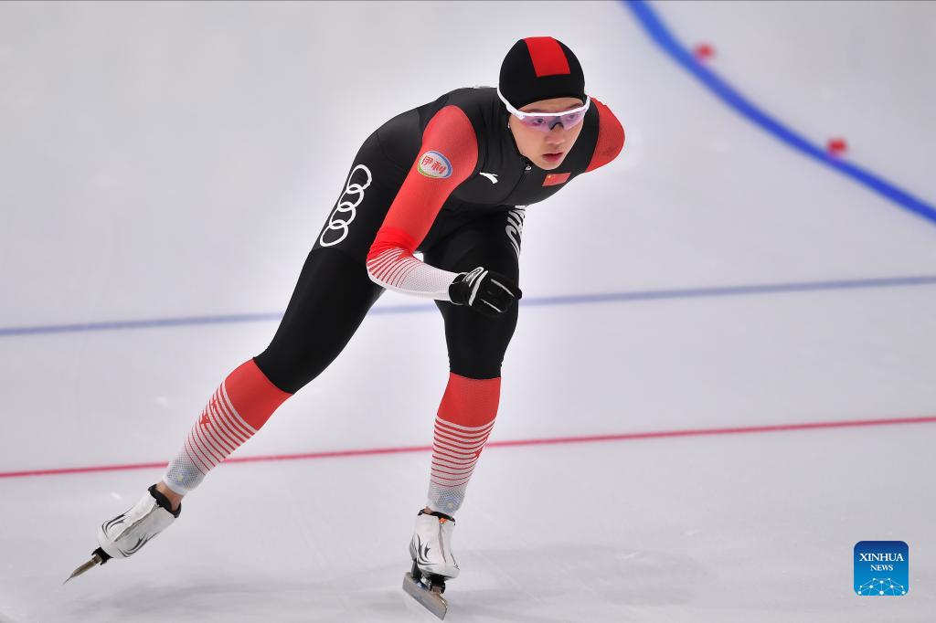 Yang Binyu of China competes during the Experience Beijing Speed Skating China Open Women's 3000m in Beijing, China on Oct. 8, 2021. (Xinhua/Chen Yichen)