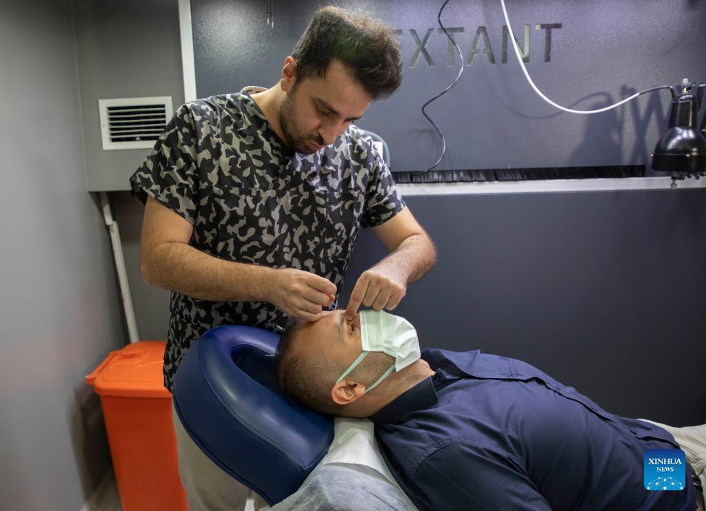 Ceyhun Dundar, a Turkish specialist, places acupuncture needles on the head of a patient in Istanbul, Turkey, Sept. 28, 2021. (Photo by Osman Orsal/Xinhua)
