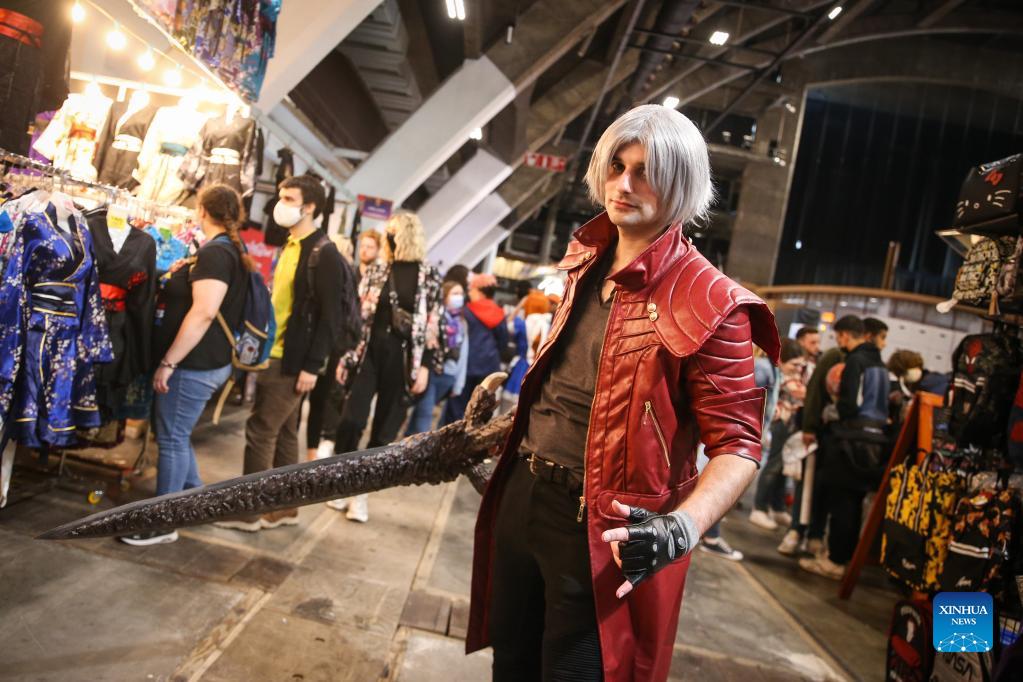 A cosplayer poses at the Made in Asia animation and cartoon products fair in Brussels, Belgium, Oct. 8, 2021. (Xinhua/Zheng Huansong)