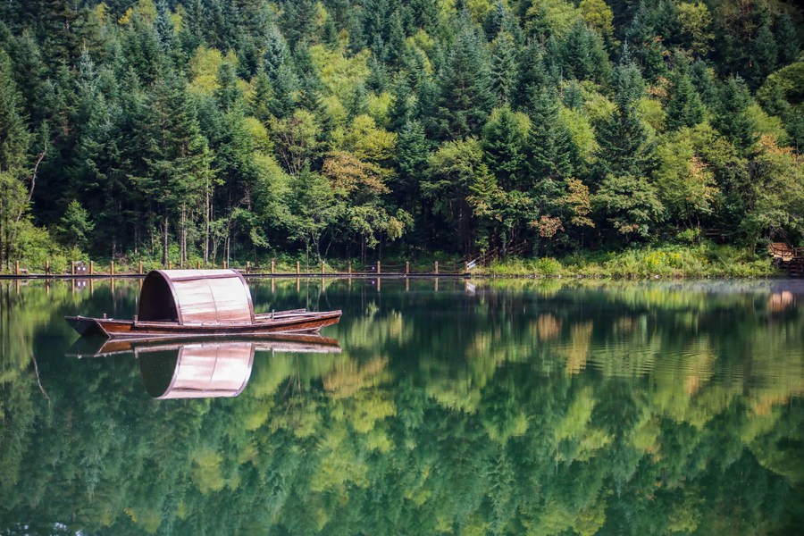 Photo taken on Aug. 26, 2021 shows a view of the Zedang Lake at Guan'egou national forest park in Dangchang County of Longnan, northwest China's Gansu Province. (Xinhua/Ma Xiping)