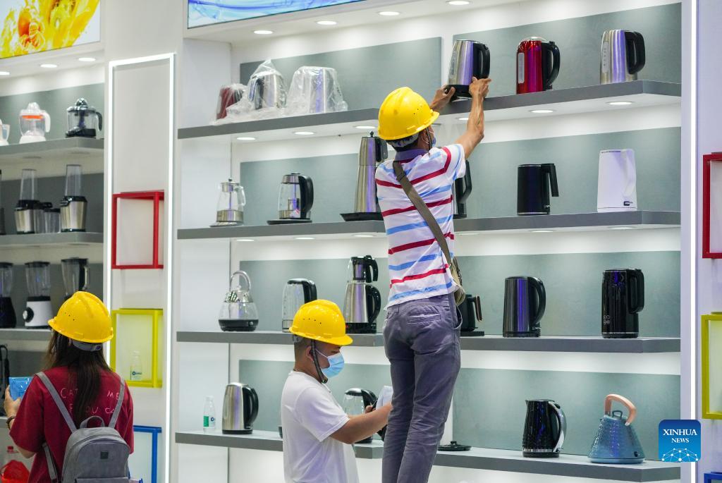Staff members lay out exhibits at the exhibition center that is going to host the 130th session of the China Import and Export Fair in Guangzhou, south China's Guangdong Province, Oct. 9, 2021. The fair is slated to open here on Oct. 15. (Xinhua/Liu Dawei)