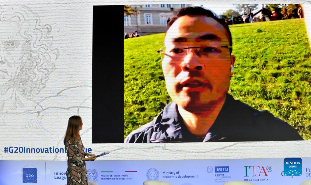 A representative of China's Sansure Biotech speaks via a video link during a meeting of the G20 Innovation League in Sorrento, southern Italy, on Oct. 10, 2021. Chinese startup Sansure Biotech on Sunday won the award for healthcare innovation at the G20 Innovation League, a competition between 100 startups from over 20 countries. Held both in presence and online over the weekend in the southern Italy's city of Sorrento, the competition saw five groups of twenty startups proposing innovative products and solutions in five different competitive sessions, each concerning one of the five main challenges currently faced by mankind: Cleantech, Artificial Intelligence (AI), Internet of Things and Wearables, Smart Cities and Mobility, and Healthcare. (Xinhua/Liu Yongqiu)