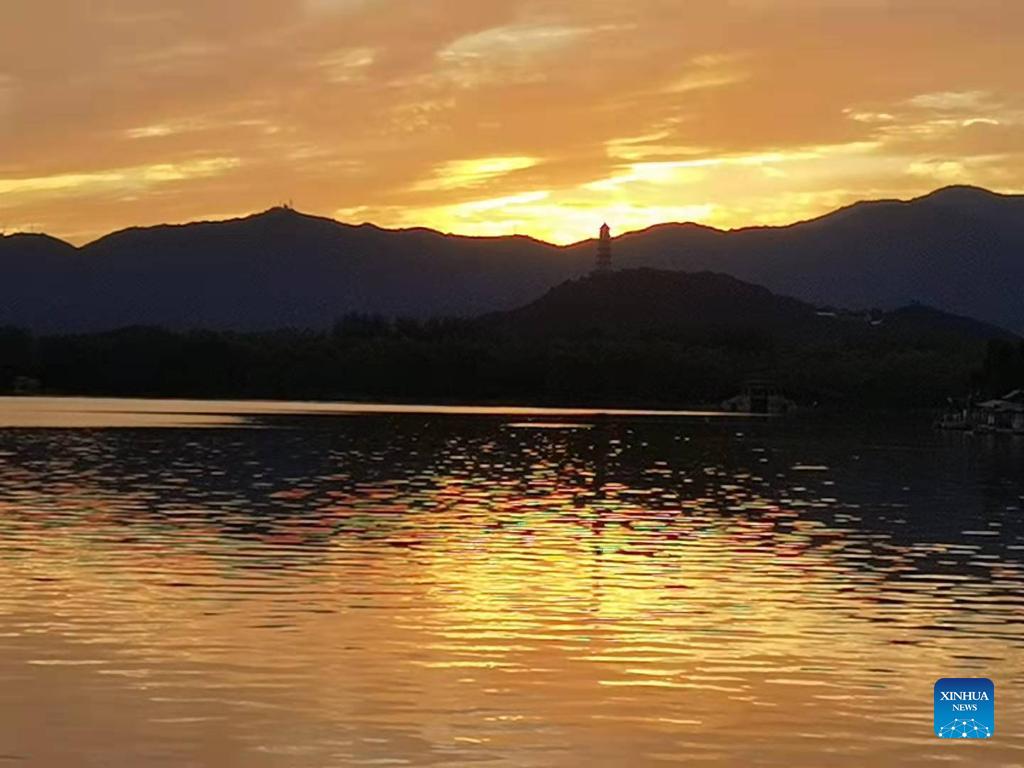 Cellphone photo taken on Oct. 10, 2021 shows the view of sunset glow at the Summer Palace in Beijing, capital of China. (Xinhua/Chen Jianli)
