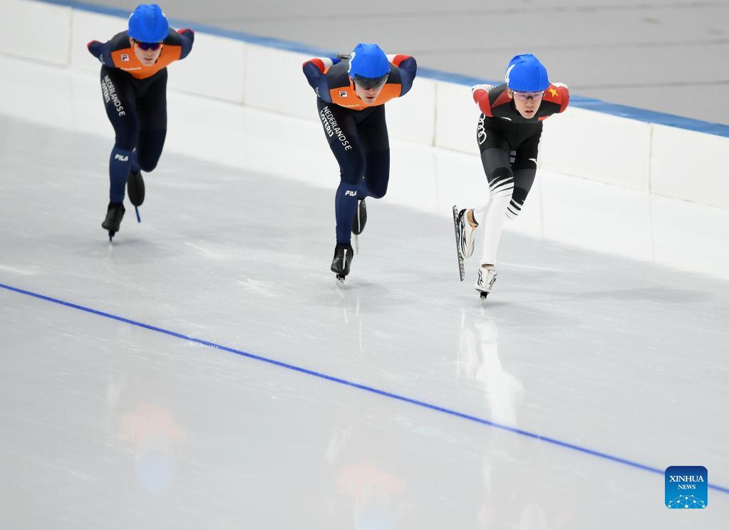Lan Tianhong (R) of China and Kayo Vos (C), Tim Prins of the Netherlands compete during the men's mass start competition at the Experience Beijing Speed Skating China Open in Beijing, capital of China, on Oct. 10, 2021. (Xinhua/Zhang Chenlin)