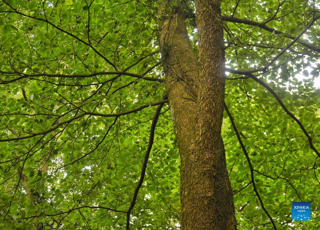 Photo taken on Oct. 8, 2021 shows an emmenopterys henryi tree in the Longquanshan city forest park in Chengdu, southwest China's Sichuan Province. A total of 35 emmenopterys henryi trees have been found in the city forest park. The plant is under China's second-class protection. (Xinhua/Liu Kun)