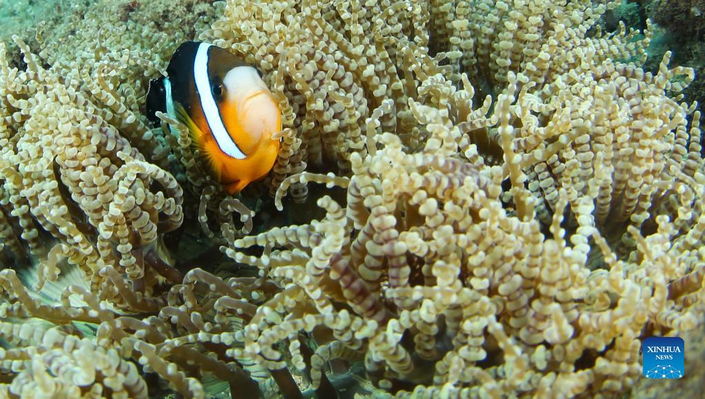Photo taken on Sept. 29, 2021 shows a clownfish and sea anemone in the waters of Fenjiezhou Island of Hainan Province, south China. Fenjiezhou Island, located in the Lingshui Li Autonomous County, boasts coral reef ecosystem. Before proper development and management, the coral reefs, as well as seabed ecology, have been severely damaged due to illegal exploitation. To restore the local underwater ecology, Fenjiezhou scenic area authorities, together with oceanic and fishery researchers, have been growing and transplanting corals since 2004. Meanwhile, fishermen have been offered jobs in the scenic area. After over ten years of protection and restoration, the coral coverage rate of Fenjiezhou Island waters has reached 34 percent, with some area reaching 40 percent to 50 percent. The improvement of underwater ecosystem has attracted more marine creatures. (Xinhua/Yang Guanyu)