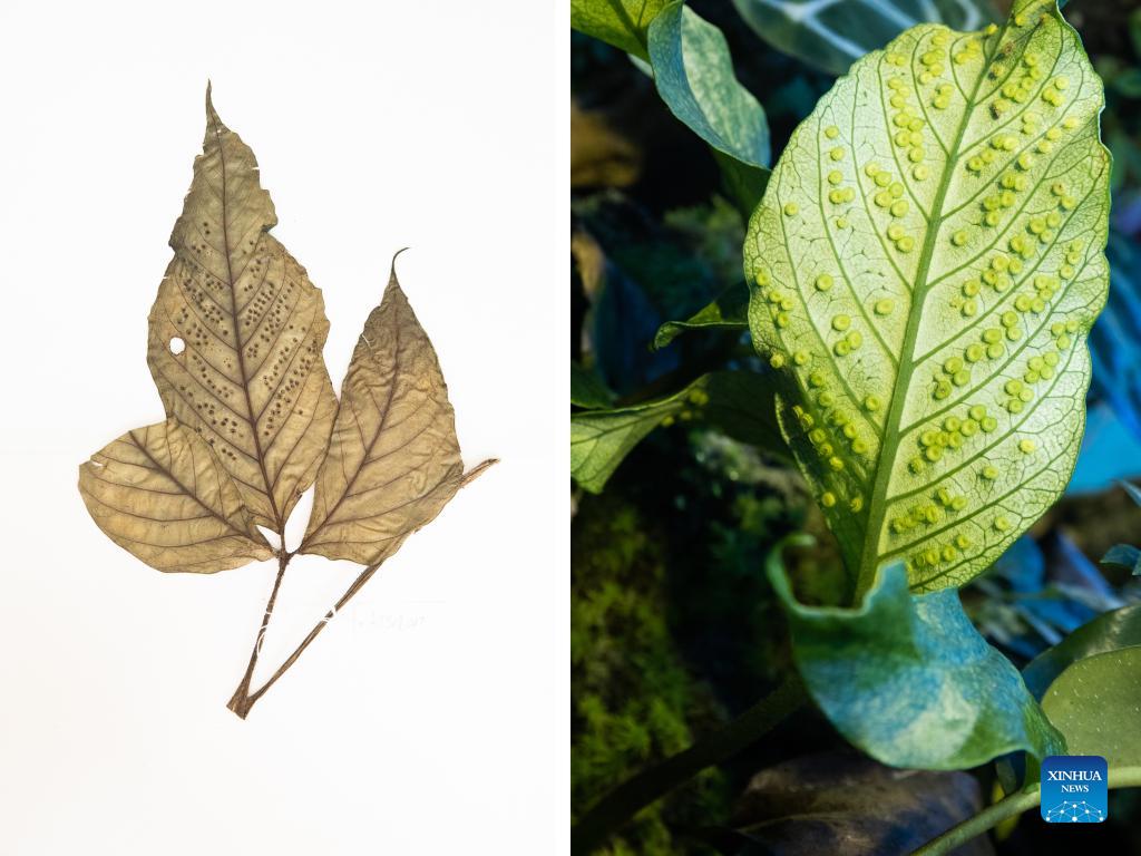 Combo photo taken on Oct. 10, 2021 shows a sample of Christensenia assamica collected by researchers in the wild (L) and a transplanted Christensenia assamica plant growing in the Kunming Botanical Garden in Kunming, southwest China's Yunnan Province. Kunming Botanical Garden has built a garden featuring Plant Species with Extremely Small Populations (PSESP) since 2015. Currently, a total of 44 rare target species have been transplanted into the garden under protection efforts. (Xinhua/Jin Liwang)