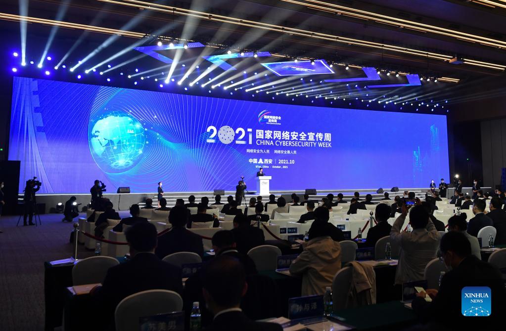The opening ceremony of 2021 China Cybersecurity Week is held in Xi'an, capital of northwest China's Shaanxi Province, Oct. 11, 2021. This year's edition of China's annual cybersecurity publicity week runs from Oct. 11 to 17 nationwide. (Xinhua/Zhang Bowen)