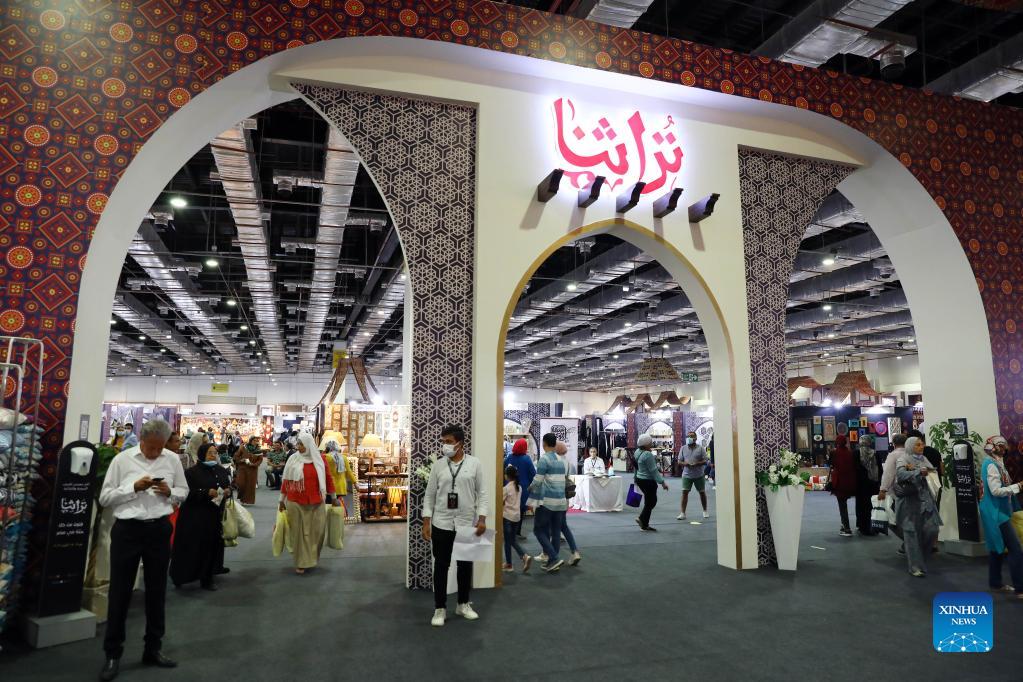 People visit a heritage exhibition in Cairo, Egypt, on Oct. 10, 2021. Around 1,500 artisans specialized in heritage works have showcased their products in Egypt's largest annual heritage exhibition. Dubbed "Our Heritage", the exhibition organized by the Micro, Small and Medium Enterprise Development Agency, kicked off in Cairo on Oct. 9 and will conclude on Oct. 15. (Xinhua/Ahmed Gomaa)