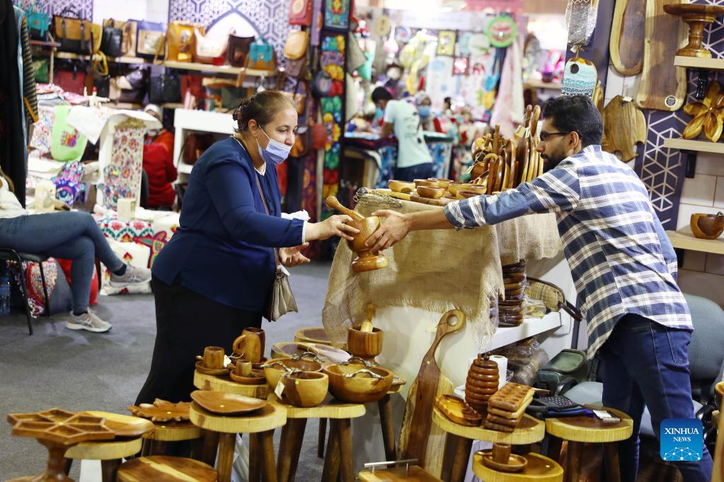 A visitor (L) buys wood products at a booth during a heritage exhibition in Cairo, Egypt, on Oct. 10, 2021. Around 1,500 artisans specialized in heritage works have showcased their products in Egypt's largest annual heritage exhibition. Dubbed "Our Heritage", the exhibition organized by the Micro, Small and Medium Enterprise Development Agency, kicked off in Cairo on Oct. 9 and will conclude on Oct. 15. (Xinhua/Ahmed Gomaa)