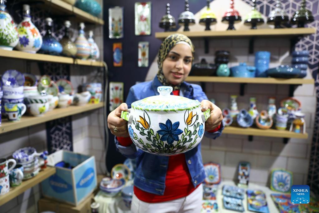 An exhibitor shows a ceramic during a heritage exhibition in Cairo, Egypt, on Oct. 10, 2021. Around 1,500 artisans specialized in heritage works have showcased their products in Egypt's largest annual heritage exhibition. Dubbed "Our Heritage", the exhibition organized by the Micro, Small and Medium Enterprise Development Agency, kicked off in Cairo on Oct. 9 and will conclude on Oct. 15. (Xinhua/Ahmed Gomaa)