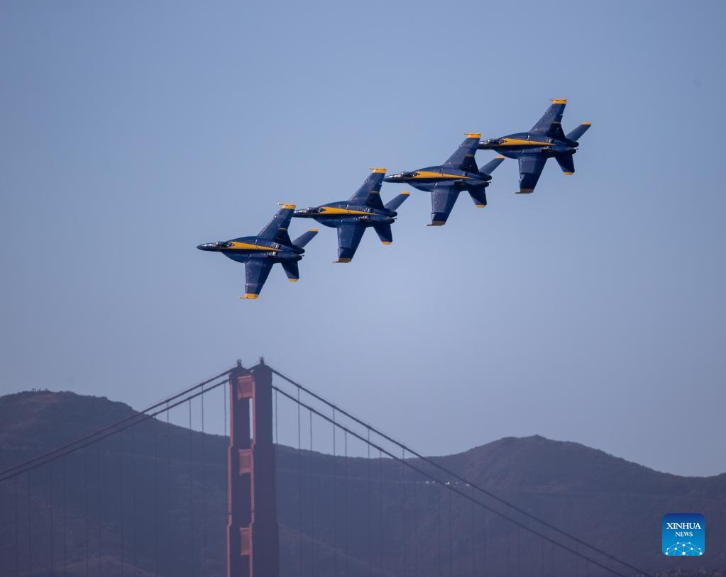 U.S. Navy aerobatics team Blue Angels perform during an air show of the annual Fleet Week activities in San Francisco, the United States, Oct. 10, 2021. (Photo by Dong Xudong/Xinhua)