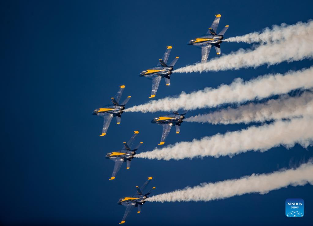 U.S. Navy aerobatics team Blue Angels perform during an air show of the annual Fleet Week activities in San Francisco, the United States, Oct. 10, 2021. (Photo by Dong Xudong/Xinhua)