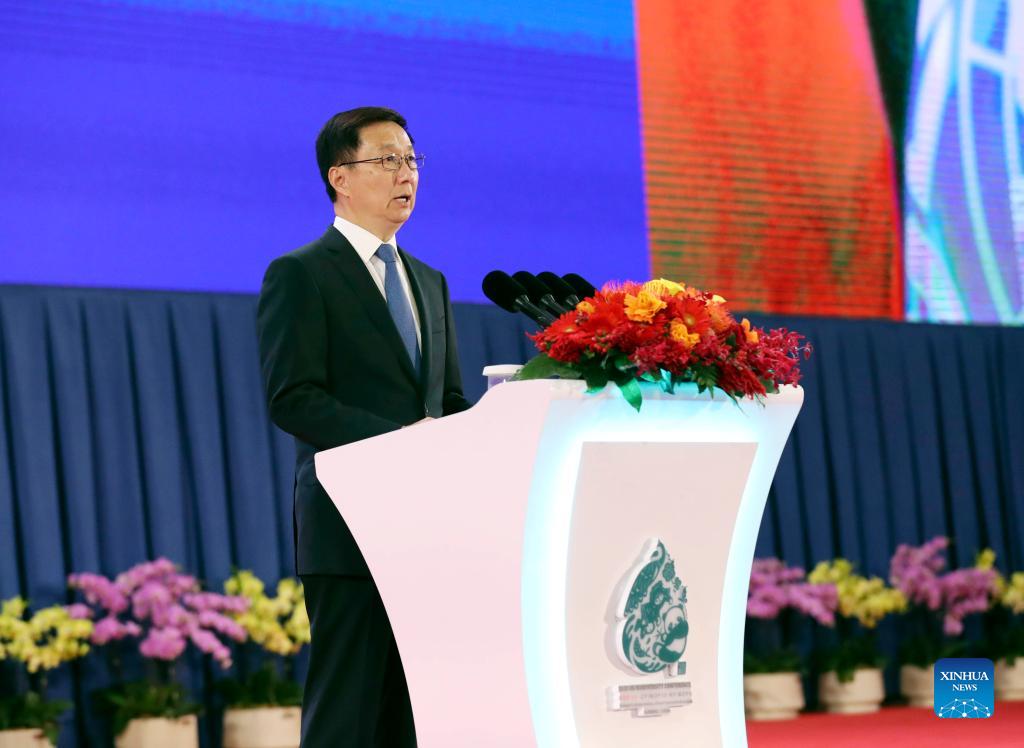Chinese Vice Premier Han Zheng, also a member of the Standing Committee of the Political Bureau of the Communist Party of China Central Committee, addresses the 15th meeting of the Conference of the Parties to the Convention on Biological Diversity, known as COP15, in Kunming, southwest China's Yunnan Province, Oct. 11, 2021. (Xinhua/Liu Weibing)