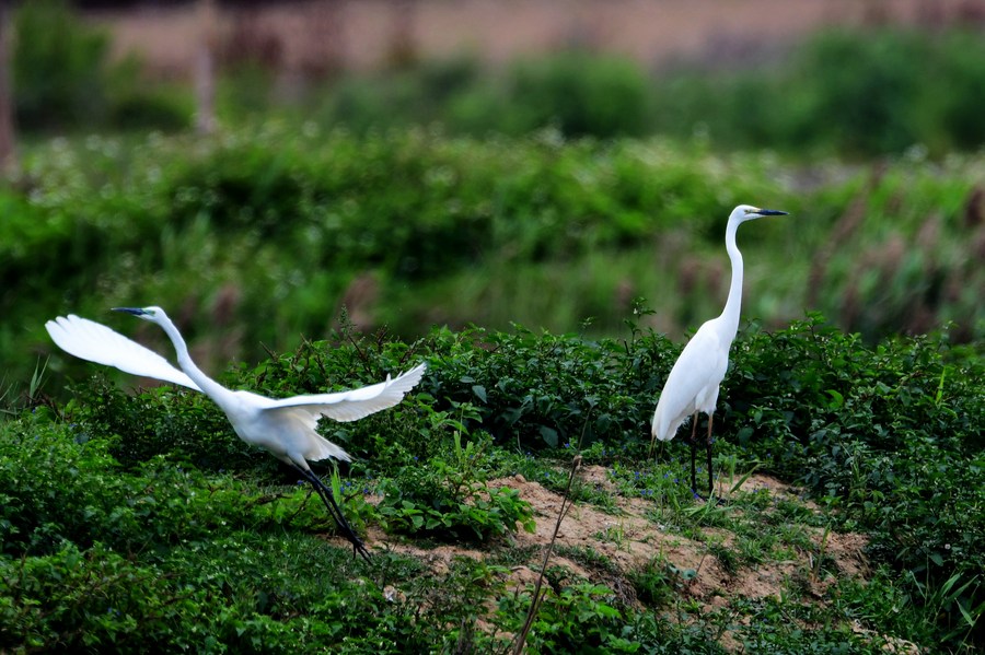 Two egrets forage in the Minjiang River estuary nature reserve in southeast China's Fujian Province, April 20, 2021. (Xinhua/Wei Peiquan)