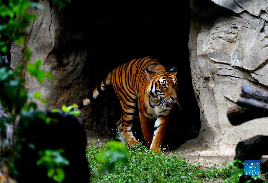 Photo taken on Oct. 11, 2021 shows a South China tiger at the Shanghai Zoo in east China's Shanghai. The South China tiger is a rare kind endemic to China and is on the national first-class protection list. Currently, a total of 28 South China tigers are living in the Shanghai Zoo. The zoo has recorded each tiger's information and established a gene bank for research, and tigers are treated and bred in a scientific way. (Xinhua/Zhang Jiansong)