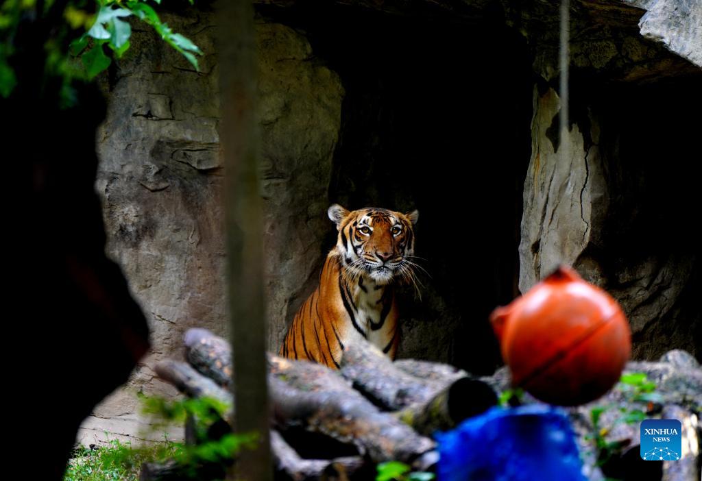 Photo taken on Oct. 11, 2021 shows a South China tiger at the Shanghai Zoo in east China's Shanghai. The South China tiger is a rare kind endemic to China and is on the national first-class protection list. Currently, a total of 28 South China tigers are living in the Shanghai Zoo. The zoo has recorded each tiger's information and established a gene bank for research, and tigers are treated and bred in a scientific way. (Xinhua/Zhang Jiansong)