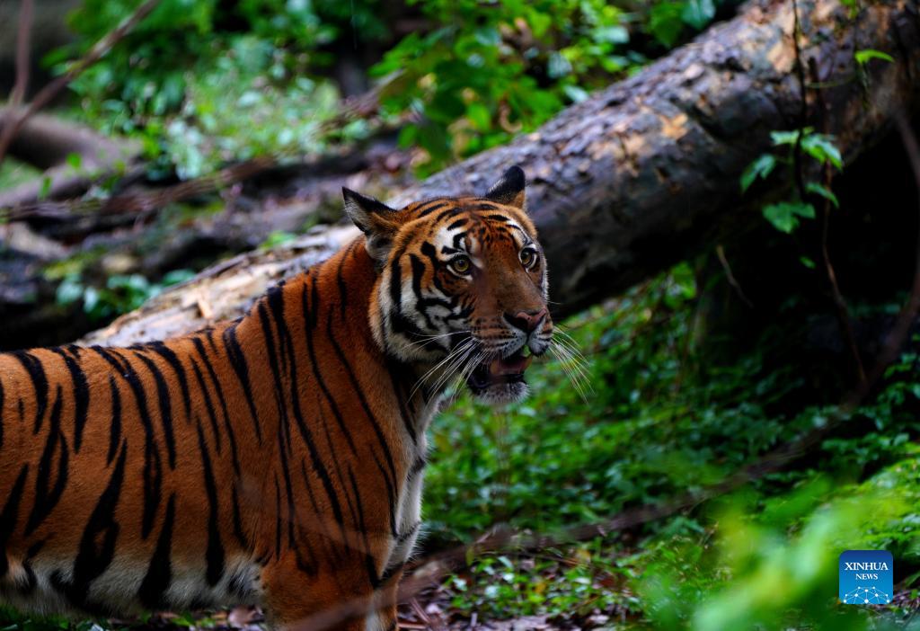 Photo taken on Oct. 11, 2021 shows a South China tiger at the Shanghai Zoo in east China's Shanghai. The South China tiger is a rare kind endemic to China and is on the national first-class protection list. Currently, a total of 28 South China tigers are living in the Shanghai Zoo. The zoo has recorded each tiger's information and established a gene bank for research, and tigers are treated and bred in a scientific way. (Xinhua/Zhang Jiansong)