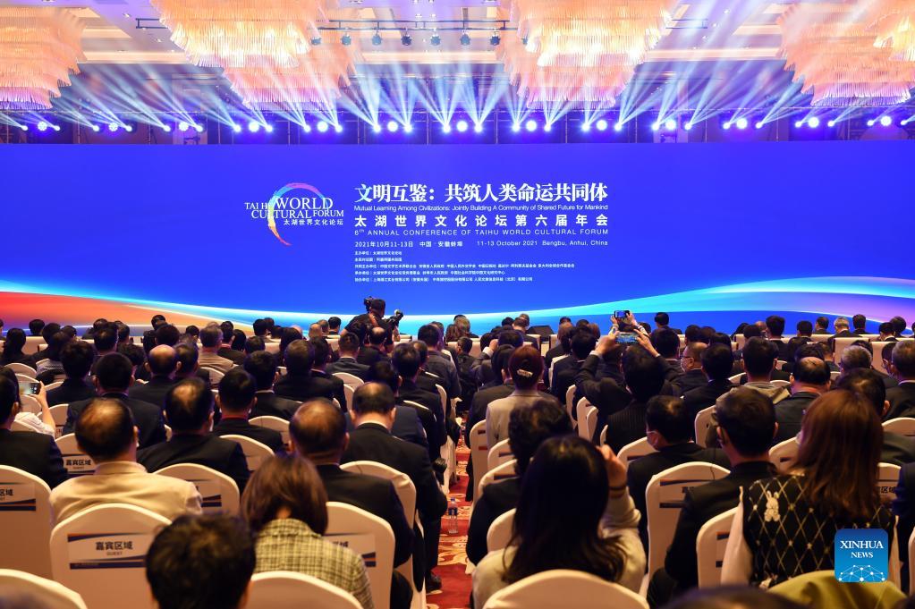 Photo taken on Oct. 12, 2021 shows a scene at the opening ceremony of the sixth annual conference of the Taihu World Cultural Forum in Bengbu, east China's Anhui Province. The sixth annual conference of the Taihu World Cultural Forum kicked off here Tuesday. (Xinhua/Zhou Mu)