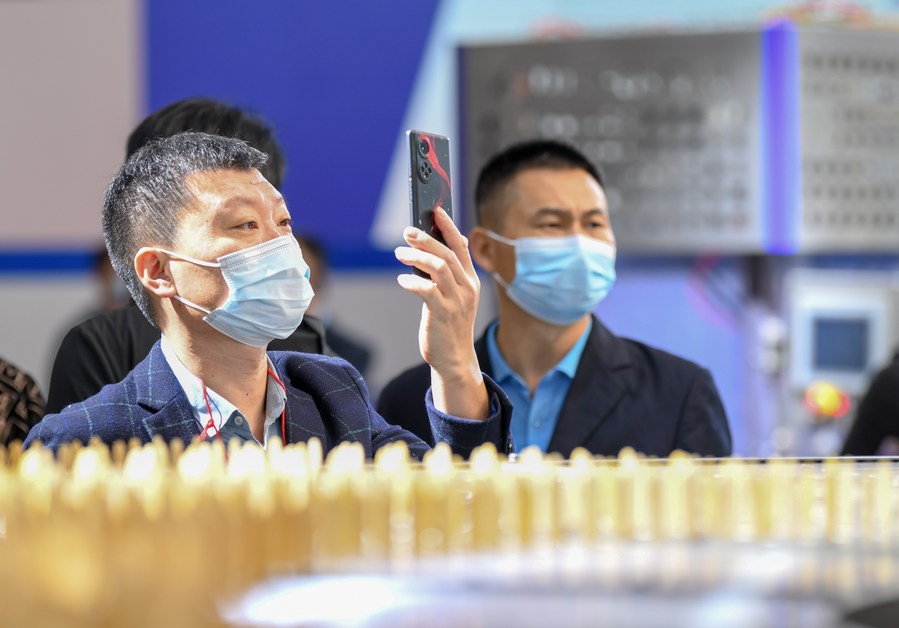 A visitor takes photos during Ice Cream China 2021 held in north China's Tianjin Municipality, Oct. 11, 2021. (Xinhua/Sun Fanyue)