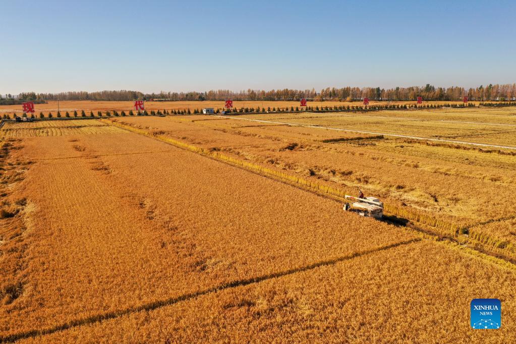 Aerial photo taken on Oct. 12, 2021 shows a farmer operating a rice harvester in Wanchang Town of Yongji County in Jilin City, northeast China's Jilin Province. (Xinhua/Zhang Nan)