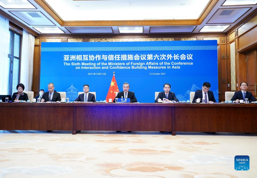 BEIJING, Oct. 12 (Xinhua) -- Chinese State Councilor and Foreign Minister Wang Yi Tuesday attended the sixth foreign ministers' meeting of the Conference on Interaction and Confidence Building Measures in Asia (CICA) via video link in Beijing.