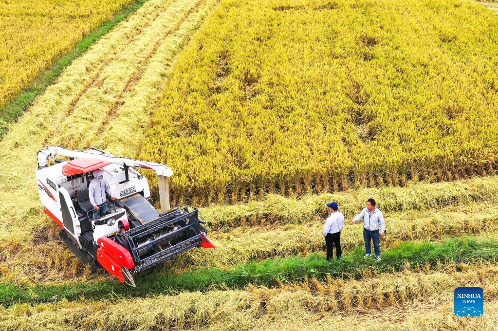 Aerial photo taken on Oct. 8, 2021 shows Zhao Xiangrong (R) talks to professor Li Ganghua of Nanjing Agricultural University in a paddy field in Leping Village of Majiang County, southwest China's Guizhou Province. Zhao Xiangrong, a former truck driver and a chef, returned to his hometown in Guizhou and started planting rice in 2015. Supported and guided by local government and experts, Zhao has developed skills in cultivating rice containing zinc, selenium and other microelement. After six years of hard work, Zhao has accumulated rich experience in sowing seeds, managing field, as well as processing, transportation and storage of rice. The rice planting area of Zhao Xiangrong reached nearly 300 mu (20 hectares) this year, and his high-quality rice has gained great reputation in many provinces of China. Zhao has vigorously shared his experience with fellow villagers and is willing to make further contribution to the development of local rice industry and rural revitalization. (Xinhua/Yang Wenbin)