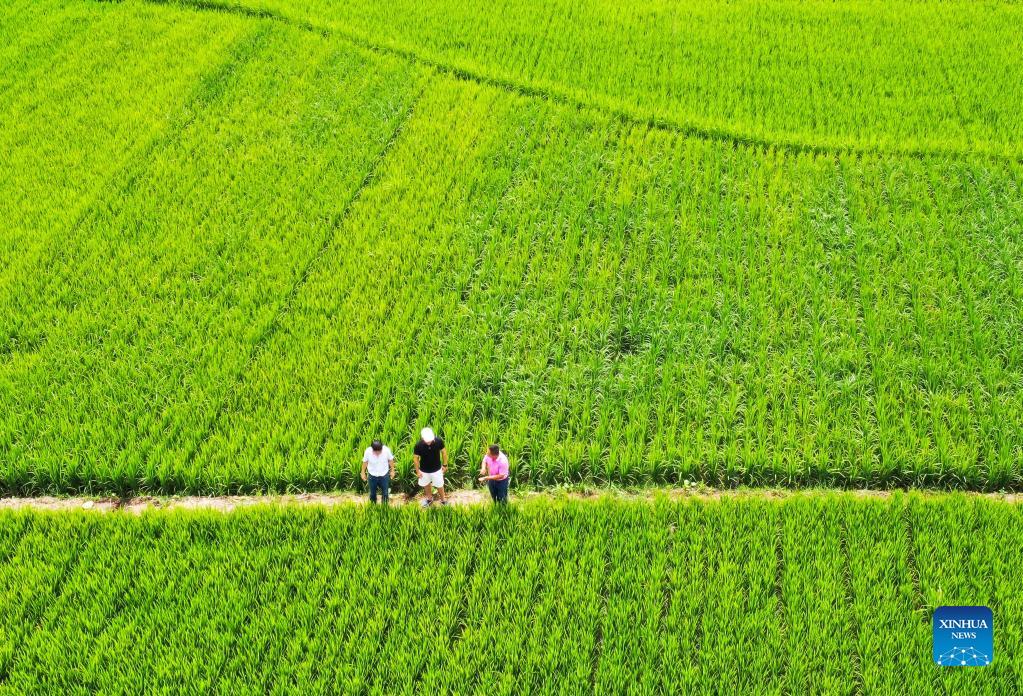 Aerial photo taken on July 19, 2021 shows Zhao Xiangrong (R) and experts of Guizhou Academy of Agricultural Sciences check the growing condition of rice in a paddy field in Leping Village of Majiang County, southwest China's Guizhou Province. Zhao Xiangrong, a former truck driver and a chef, returned to his hometown in Guizhou and started planting rice in 2015. Supported and guided by local government and experts, Zhao has developed skills in cultivating rice containing zinc, selenium and other microelement. After six years of hard work, Zhao has accumulated rich experience in sowing seeds, managing field, as well as processing, transportation and storage of rice. The rice planting area of Zhao Xiangrong reached nearly 300 mu (20 hectares) this year, and his high-quality rice has gained great reputation in many provinces of China. Zhao has vigorously shared his experience with fellow villagers and is willing to make further contribution to the development of local rice industry and rural revitalization. (Xinhua/Yang Wenbin)