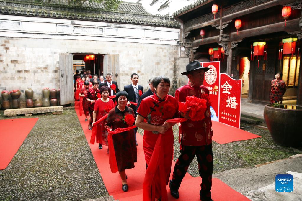 Elderly couples participate in a collective ceremony to celebrate their golden wedding anniversary in Zhenxi Village of Dongyang City, east China's Zhejiang Province, Oct. 12, 2021. The Double Ninth Festival or the Chongyang Festival is approaching. A series of celebration activities were held across the country. (Photo by Hu Yanghui/Xinhua)