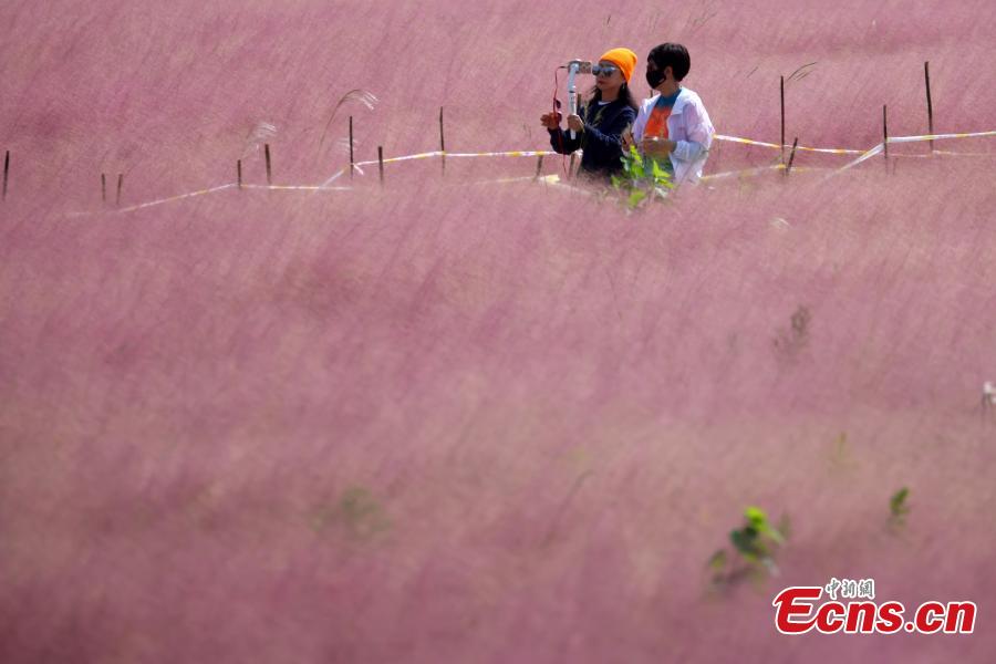 Two women take selfie in a field of pink grass (muhlenbergia capillaris) in Nanjing, capital of east China's Jiangsu Province, Oct.12, 2021. Muhly grasses create pink mist attracting many tourists. (Photo/China News Service)