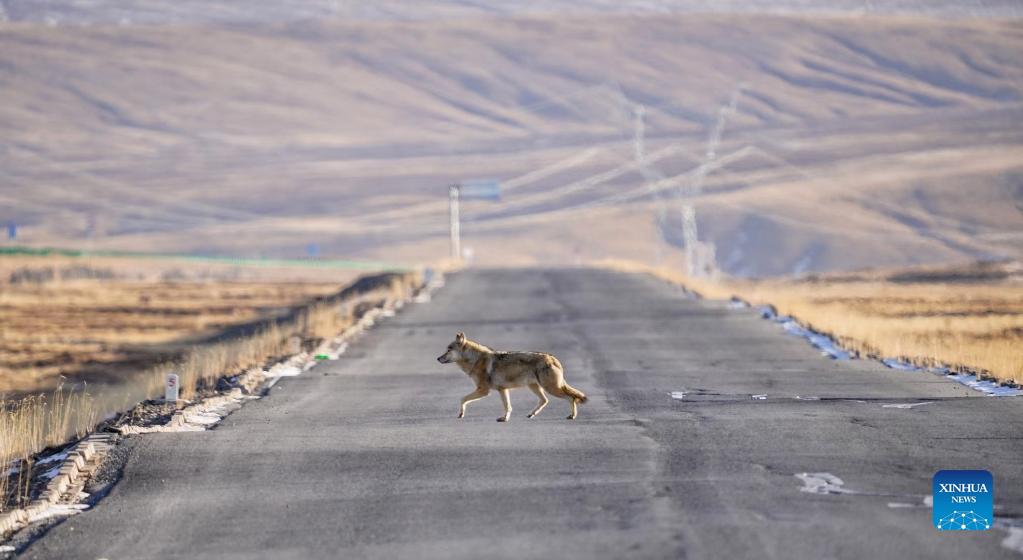 A wild wolf is seen at the source of the Yellow River section of the Sanjiangyuan National Park in northwest China's Qinghai Province, Jan. 21, 2020. Sanjiangyuan, meaning the "source of three rivers," is home to the headwaters of the Yangtze, Yellow and Lancang rivers. The ecological system has been steadily improving in recent years in the Sanjiangyuan National Park, making it a habitat of an increasing number of wild animals. (Photo by Song Zhongyong/Xinhua)