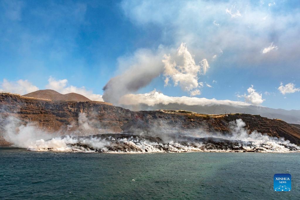 Photo released by the Canary Islands Volcanological Institute on Sept. 29, 2021 shows lava flowing out of the Cumbre Vieja volcano reaching the ocean on the island of La Palma, Canary Islands archipelago, Spain. (Spanish Institute of Oceanography/Handout via Xinhua)