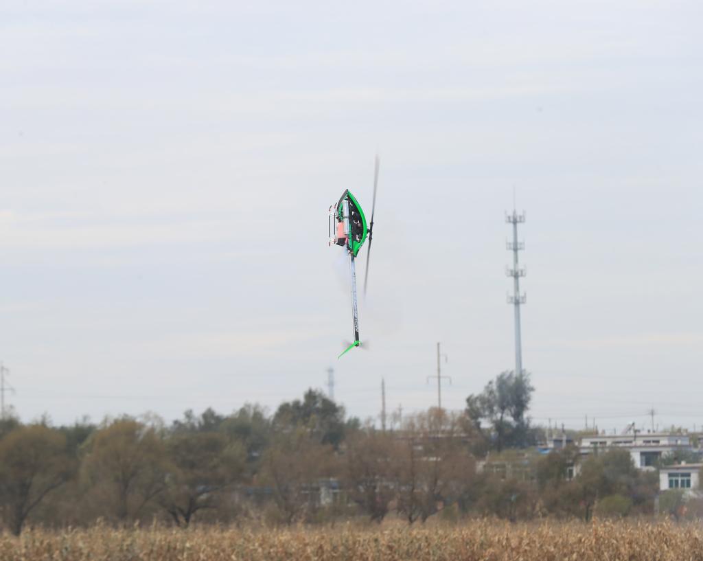 A helicopter model performs during the opening ceremony of the China International Aircraft Design Challenge final in Fuxin, northeast China's Liaoning Province, Oct. 13, 2021. The final of 2021 China International Aircraft Design Challenge kicked off here on Wednesday. More than 1700 competitors from about 70 universities attended the final. (Xinhua/Yang Qing)