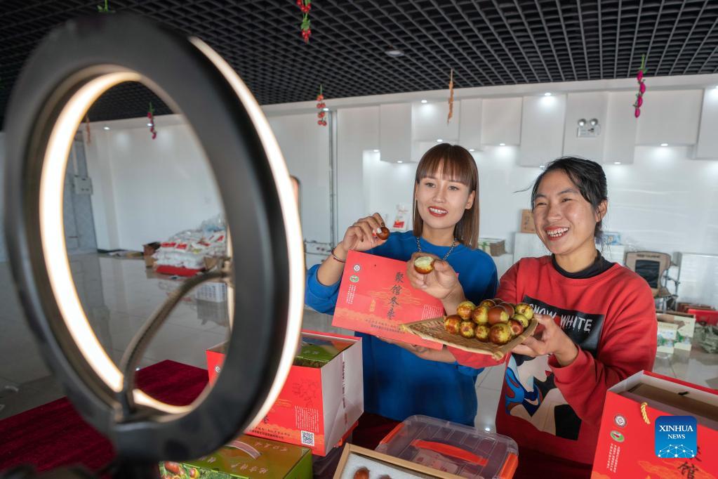Staff members sell winter jujubes via live streaming in Juguan Village, Huanghua City, north China's Hebei Province, Oct. 12, 2021. Known as the home of winter jujube, Huanghua City sees an effective increase in local people's income in recent years as the local government made great efforts in expanding the winter jujube sales channels and strengthening the winter jujube processing chain. (Xinhua/Luo Xuefeng)