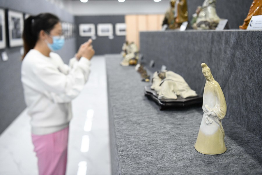 Photo taken on Oct. 13, 2021 shows a visitor to an exhibition of cultural and creative products during the Li Bai poetry festival in Ma'anshan City, east China's Anhui Province. (Xinhua/Zhang Duan)