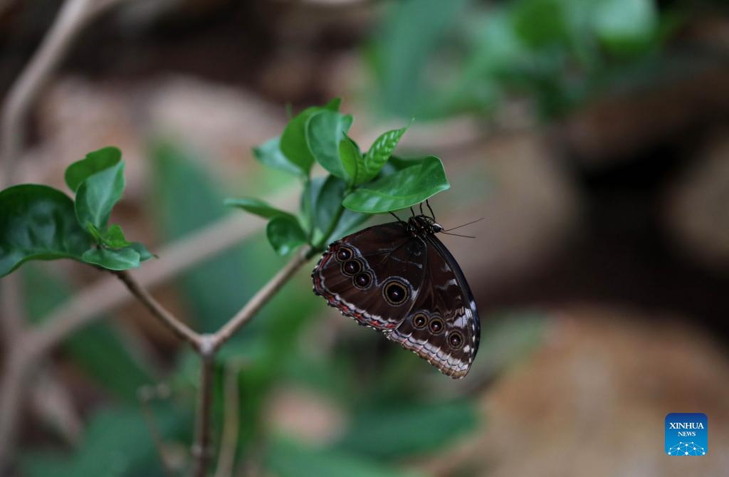 A blue morpho butterfly is seen at a zoo in Jerusalem on Oct. 12, 2021. An exhibition stepping into the world of butterflies opened this month at the zoo. (Photo by Gil Cohen Magen/Xinhua)