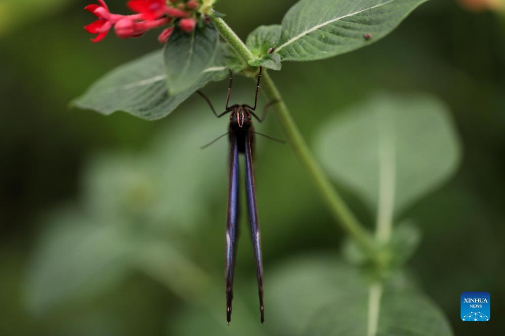 A blue morpho butterfly is seen at a zoo in Jerusalem on Oct. 12, 2021. An exhibition stepping into the world of butterflies opened this month at the zoo. (Photo by Gil Cohen Magen/Xinhua)