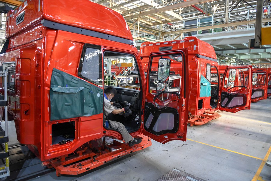 A worker assembles a vehicle at the final assembly line of truck maker FAW-Jiefang in Changchun, northeast China's Jilin Province, Jan. 5, 2021. (Xinhua/Zhang Nan)
