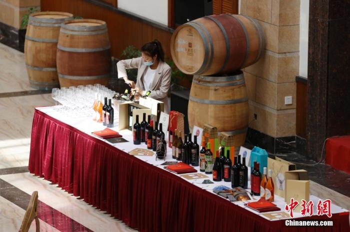 A staff member at a winery opens a bottle of red wine. (Photo/chinanews.com)