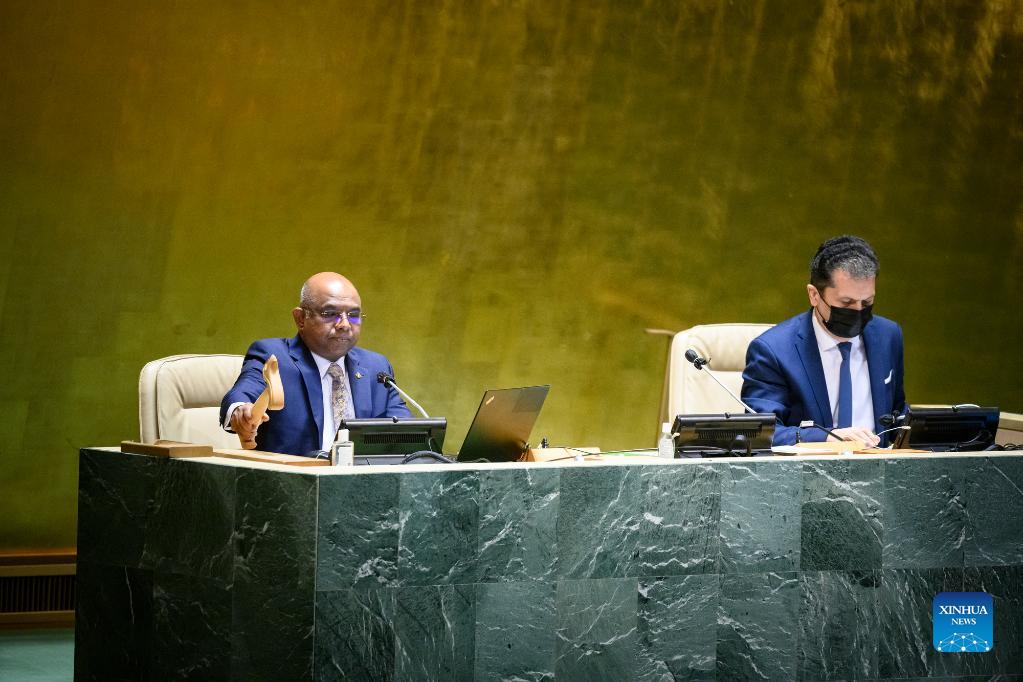 Abdulla Shahid (L), president of the 76th session of the United Nations General Assembly, presides over a General Assembly meeting at the UN Headquarters in New York, Oct. 14, 2021. The United States was on Thursday elected a member of the UN Human Rights Council, following its withdrawal in June 2018. In a vote at the UN General Assembly, the United States was elected along with 17 other countries for a three-year term beginning on Jan. 1, 2022. (UN Photo/Handout via Xinhua/Loey Felipe)