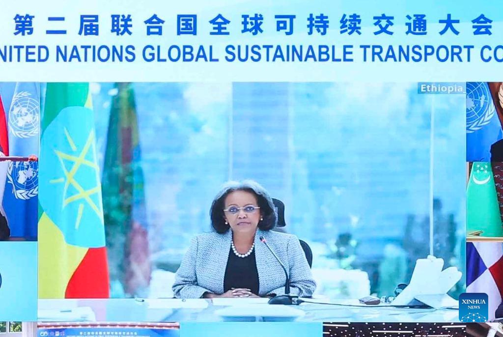 Ethiopian President Sahle-Work Zewde speaks via video link at the opening ceremony of the Second United Nations Global Sustainable Transport Conference, Oct. 14, 2021. The Second United Nations Global Sustainable Transport Conference kicked off on Thursday in Beijing. The three-day conference will be held both online and offline. (Xinhua/Yin Gang)